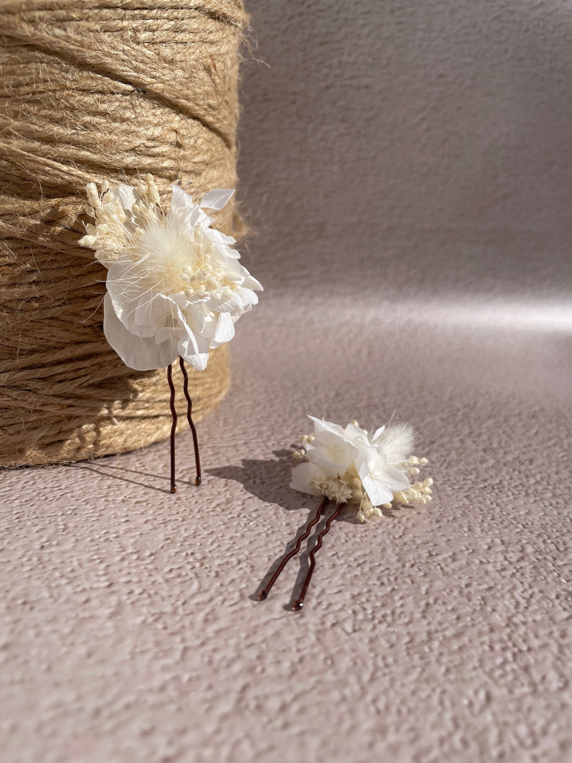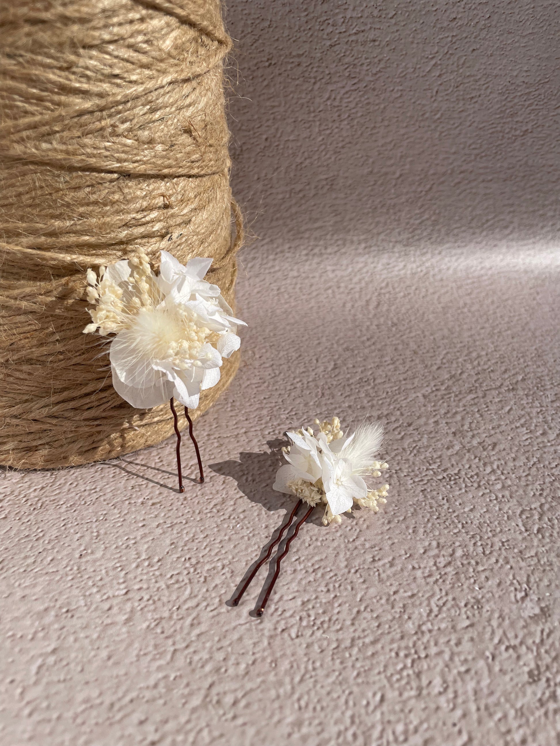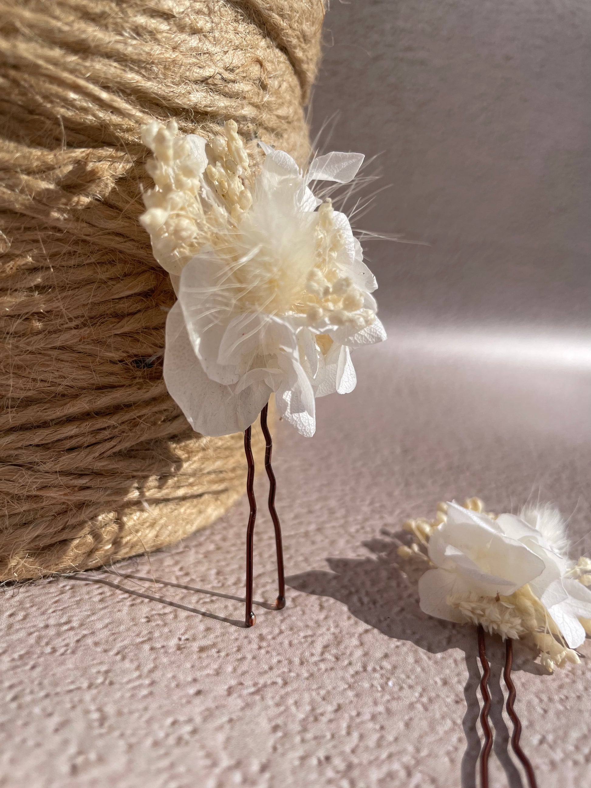 Epingle à cheveux ornée de fleurs séchées et stabilisées blanches, montée sur une base marron.