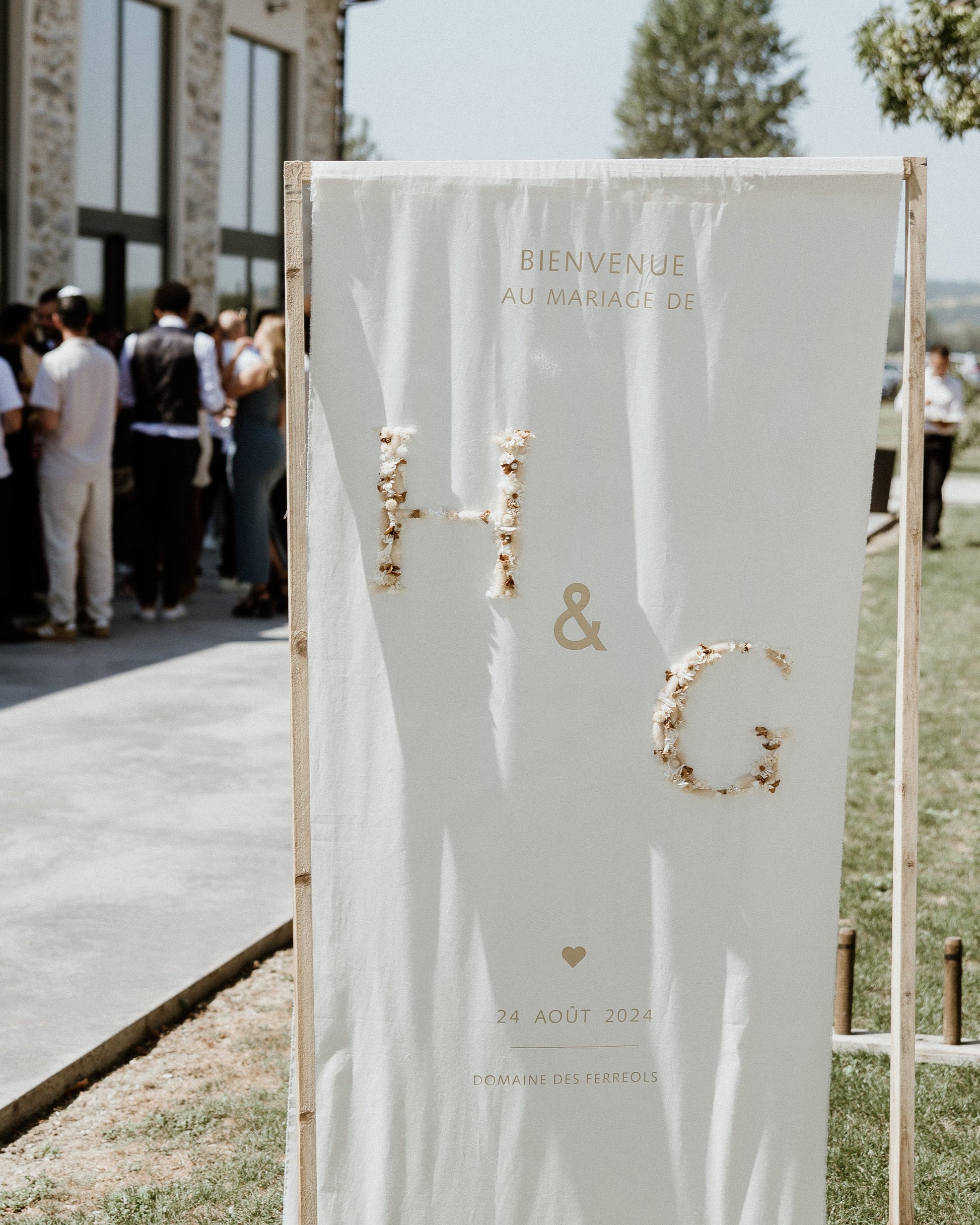 Offrez à vos invités un accueil chaleureux grâce à ce tissu de bienvenue sur-mesure, entièrement réalisé à la main, avec vos initiales inscrites en fleurs séchées et fleurs stabilisées.